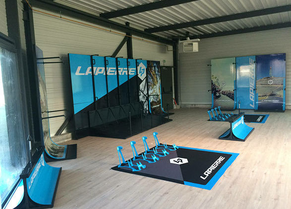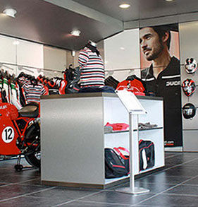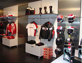 La progettazione di espositori per la vendita al dettaglio include espositori da terra per abbigliamento, caschi e altri articoli denominati stili "da tavolo" e "gondola", sistemi di pareti, "nuova isola per biciclette" (motocicli).